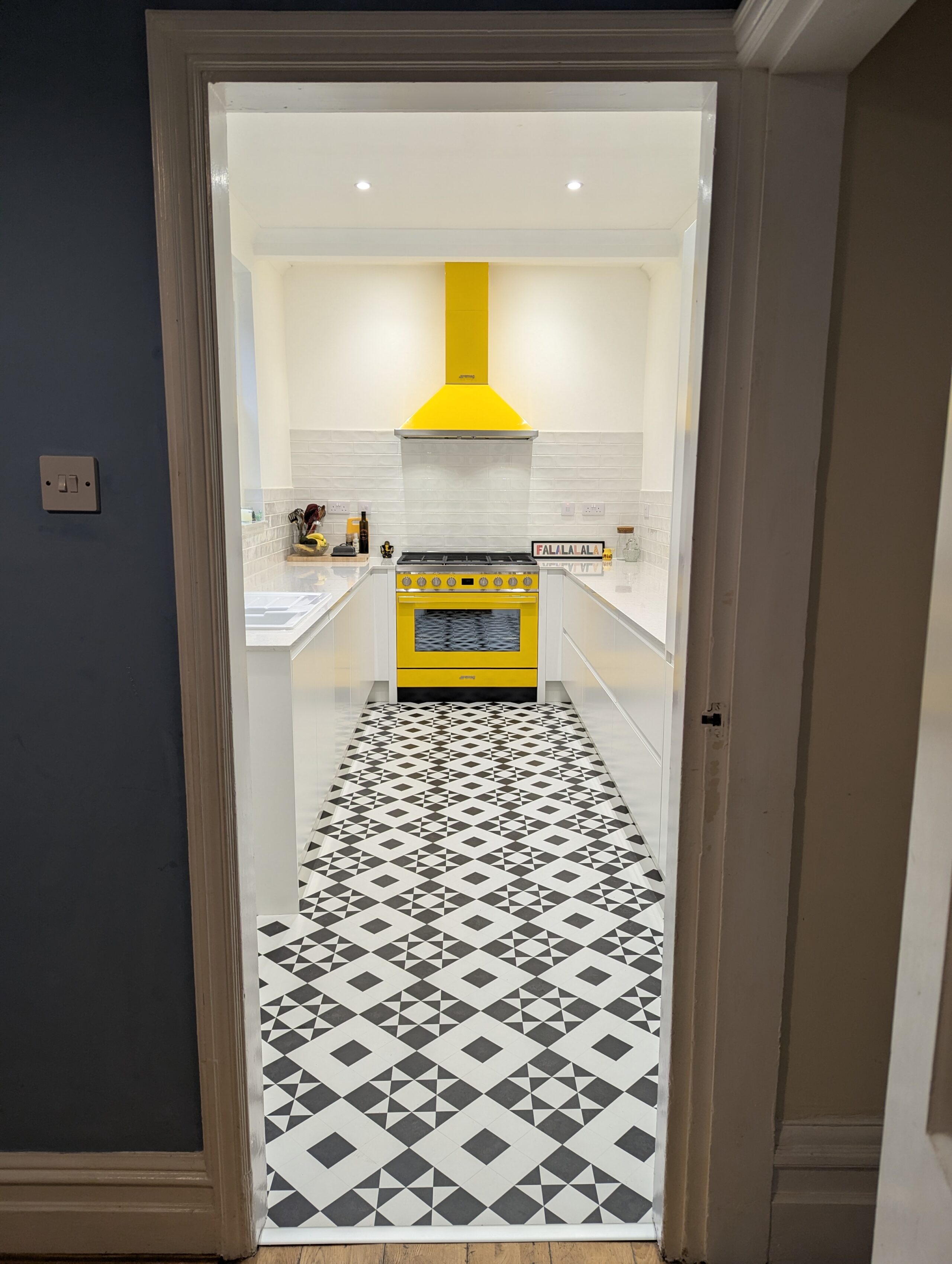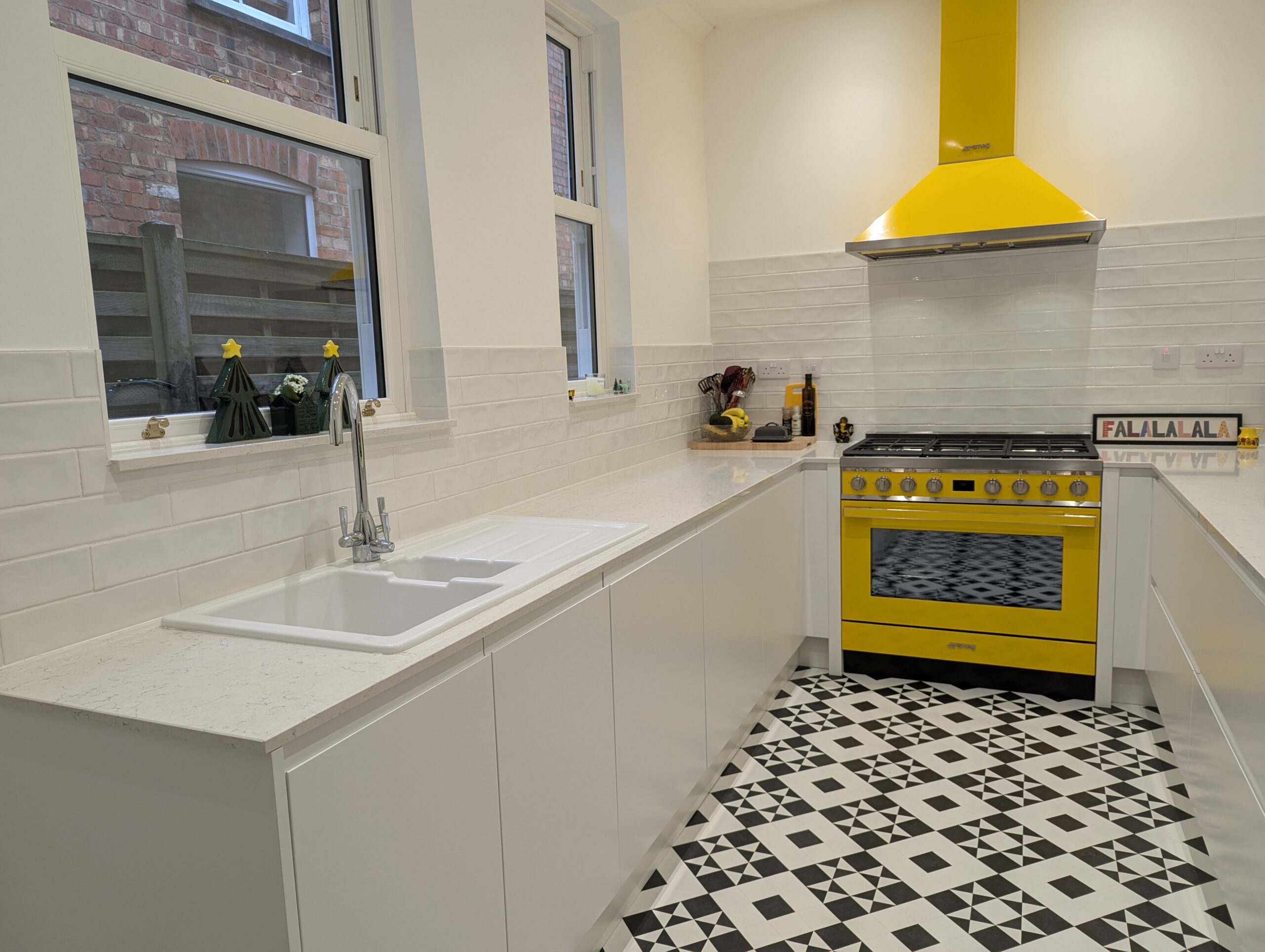 A patterned monochrome floor grounds the space adding visual interest and complementing the bold yellow elements with a sophisticated geometric touch. Abundant natural light from the twin windows enhances the clarity of the white surfaces and highlights the precision of the installation. This project reflects the confidence and creativity of Alex Lee Kitchens where clean contemporary design is elevated through thoughtful detailing and a distinctive sense of individuality.
