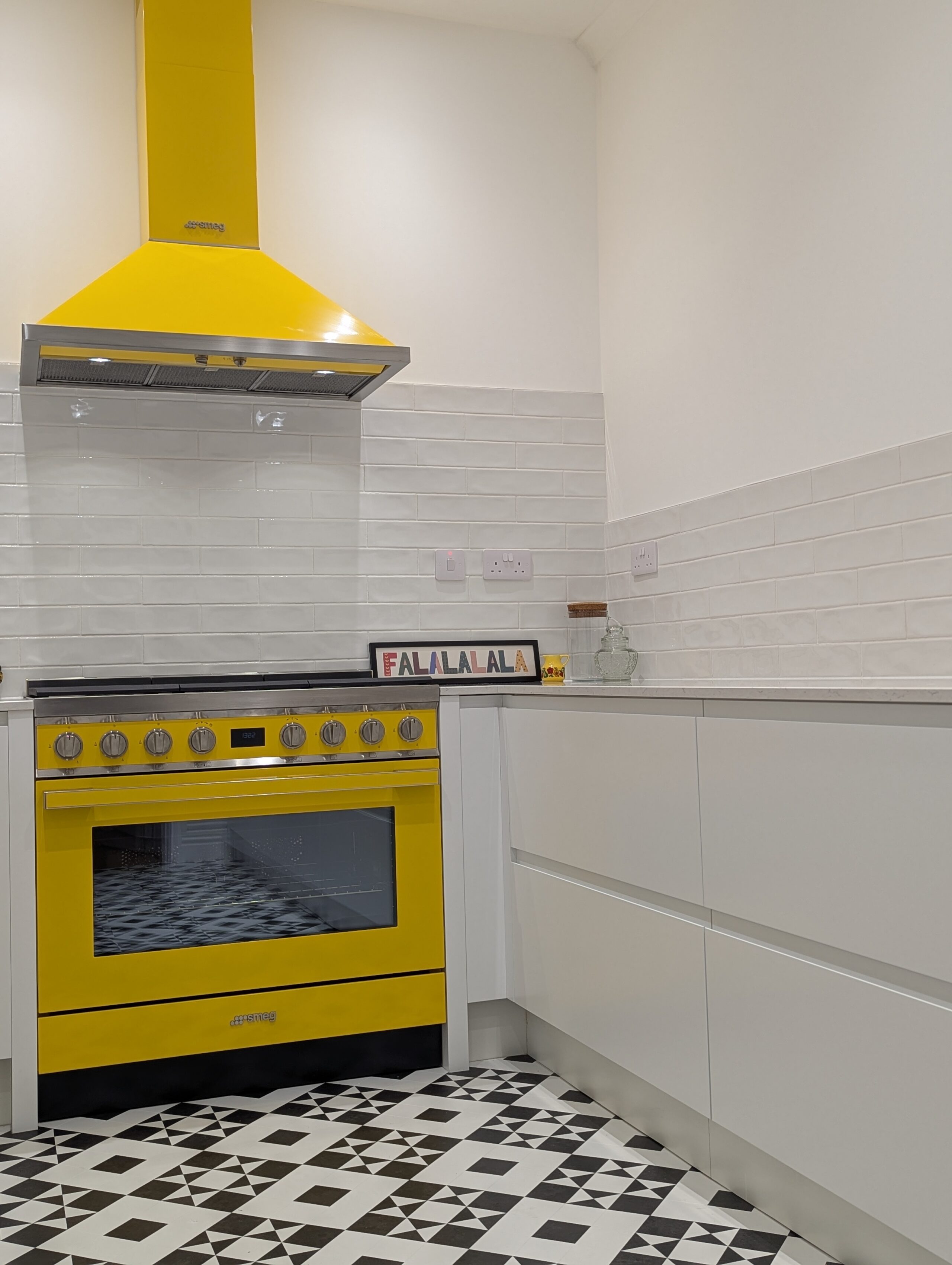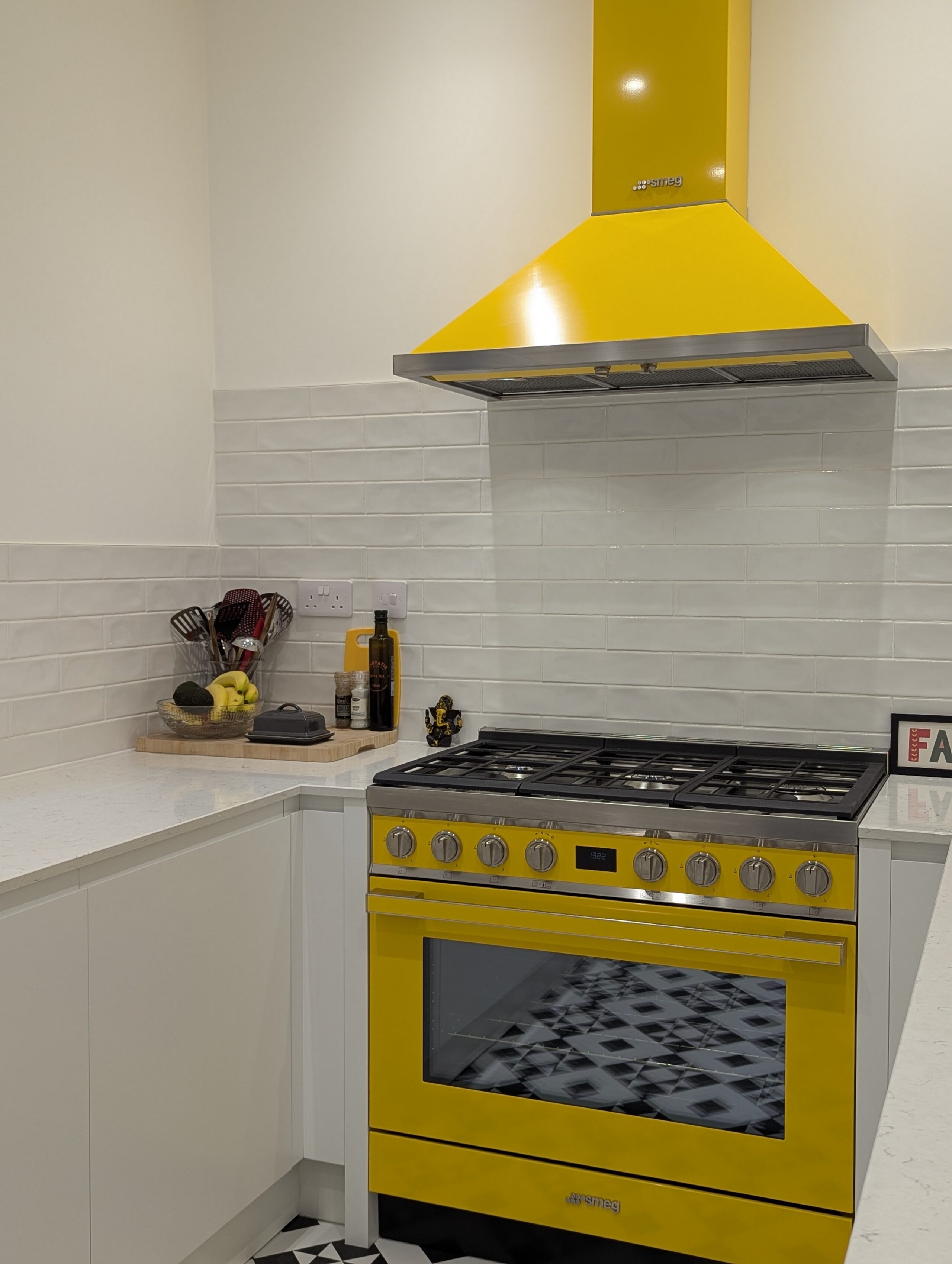 At the heart of the scheme sits a striking yellow range and matching hood which introduce an unexpected burst of colour that immediately energises the room. This statement feature contrasts beautifully with the monochrome surroundings bringing personality and character without overwhelming the calm foundation of the design. The surrounding workspace has been thoughtfully planned to deliver practical efficiency for everyday cooking and preparation.