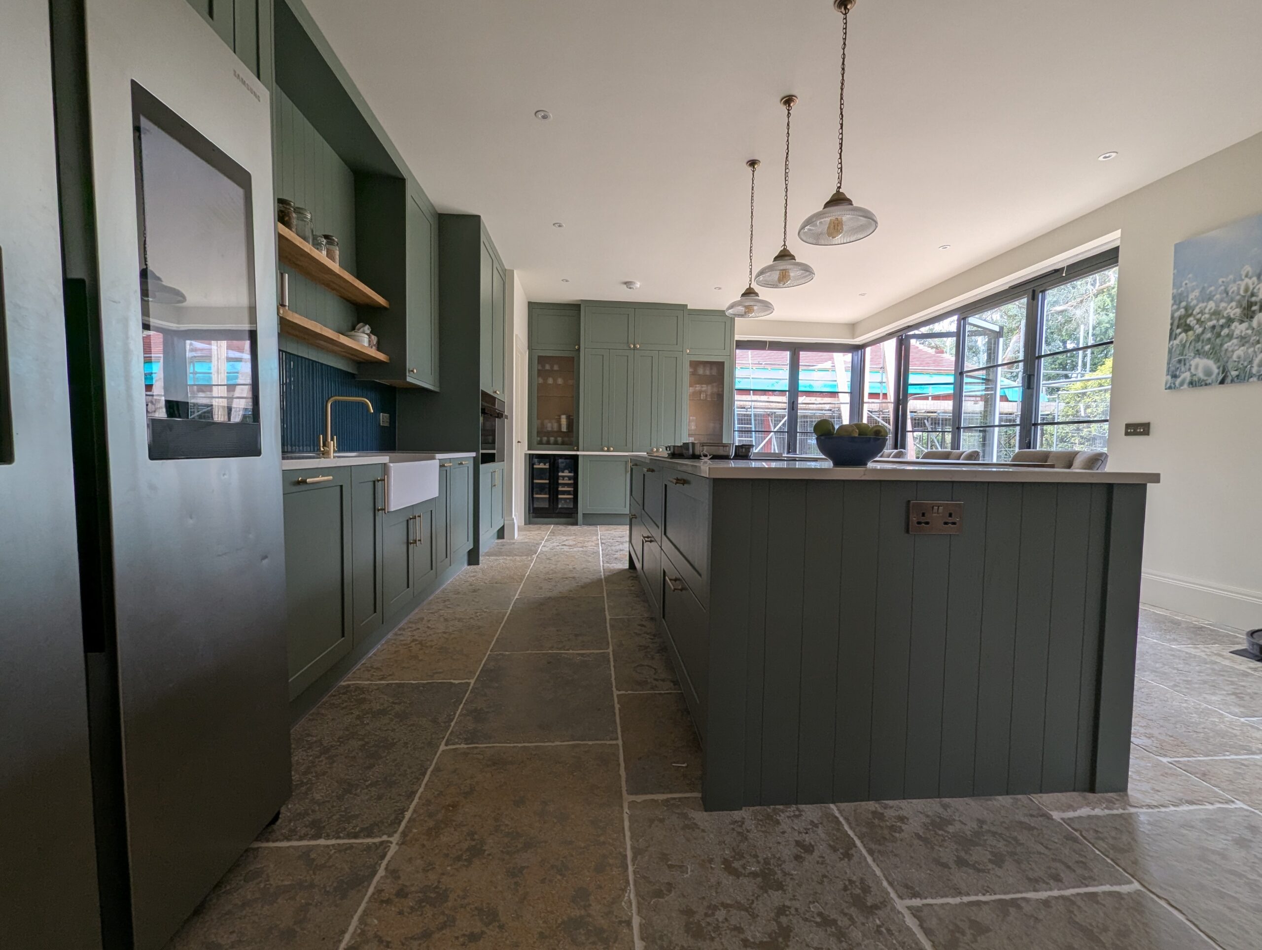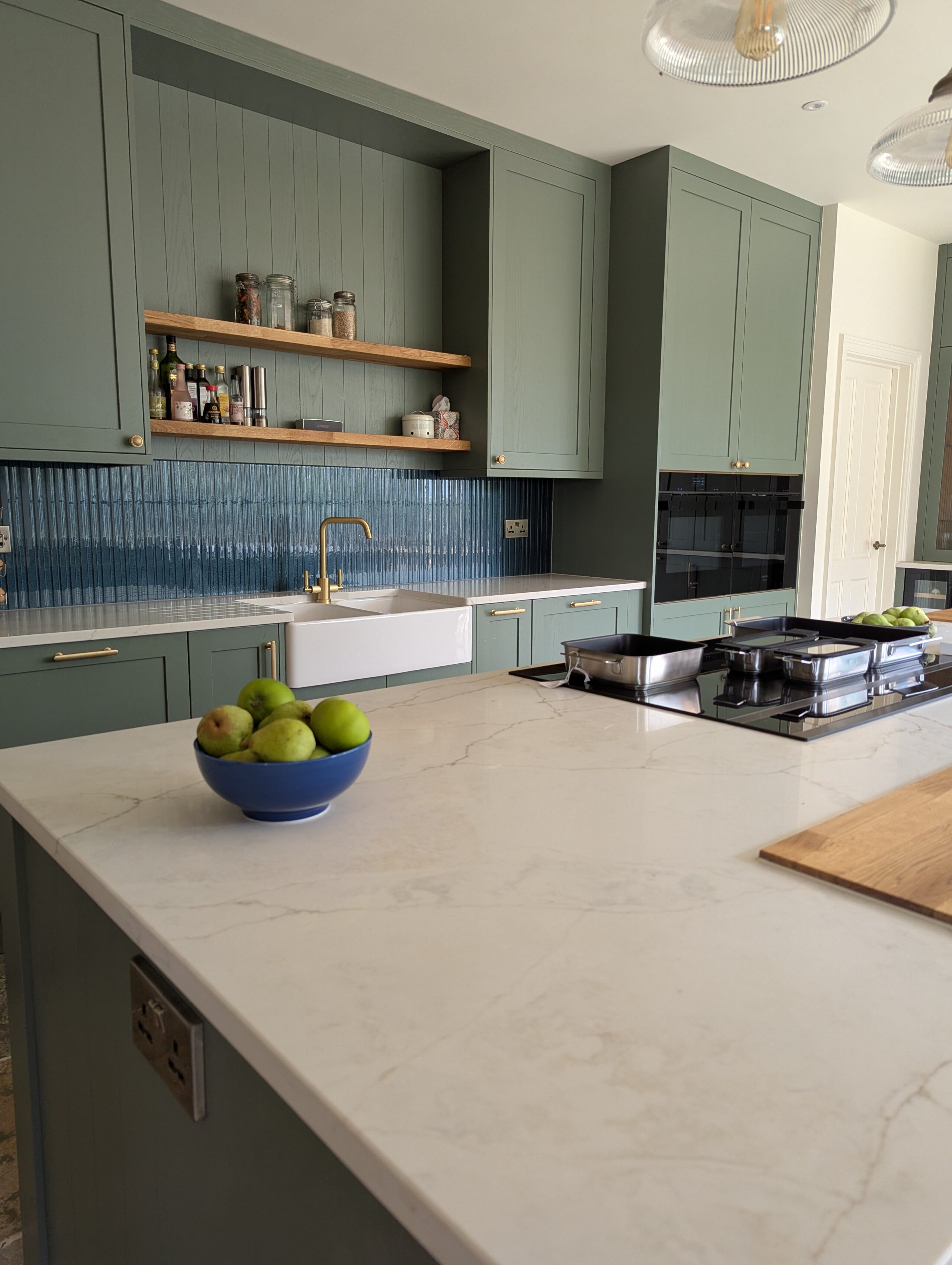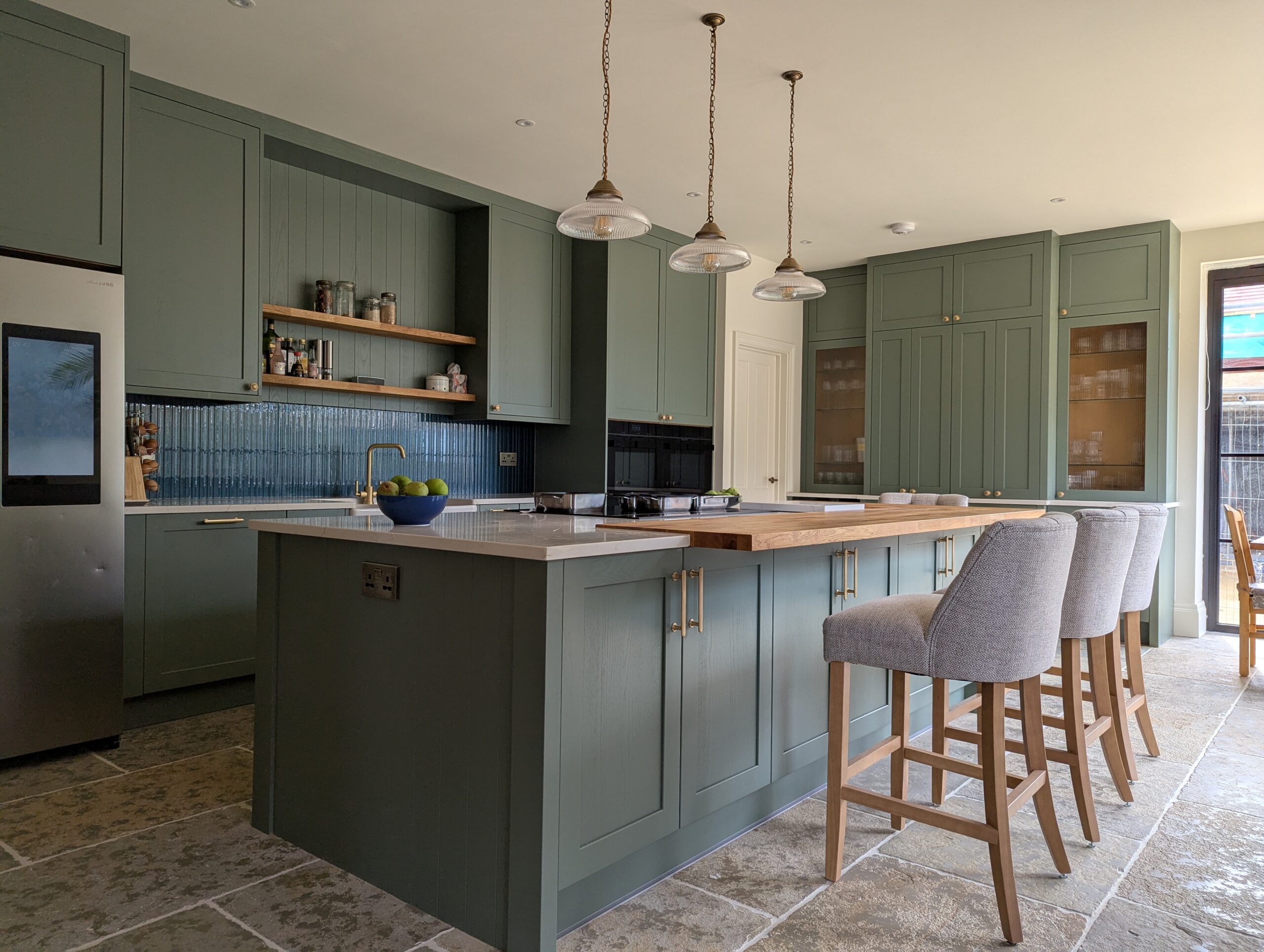 This beautifully crafted kitchen by Alex Lee Kitchens blends traditional character with a refined modern sensibility. The elegant heritage green cabinetry brings depth and warmth to the space while the classic shaker detailing gives the design a timeless quality. A glazed dresser style feature anchors one side of the room offering both display and storage that feels perfectly at home within the country inspired setting.