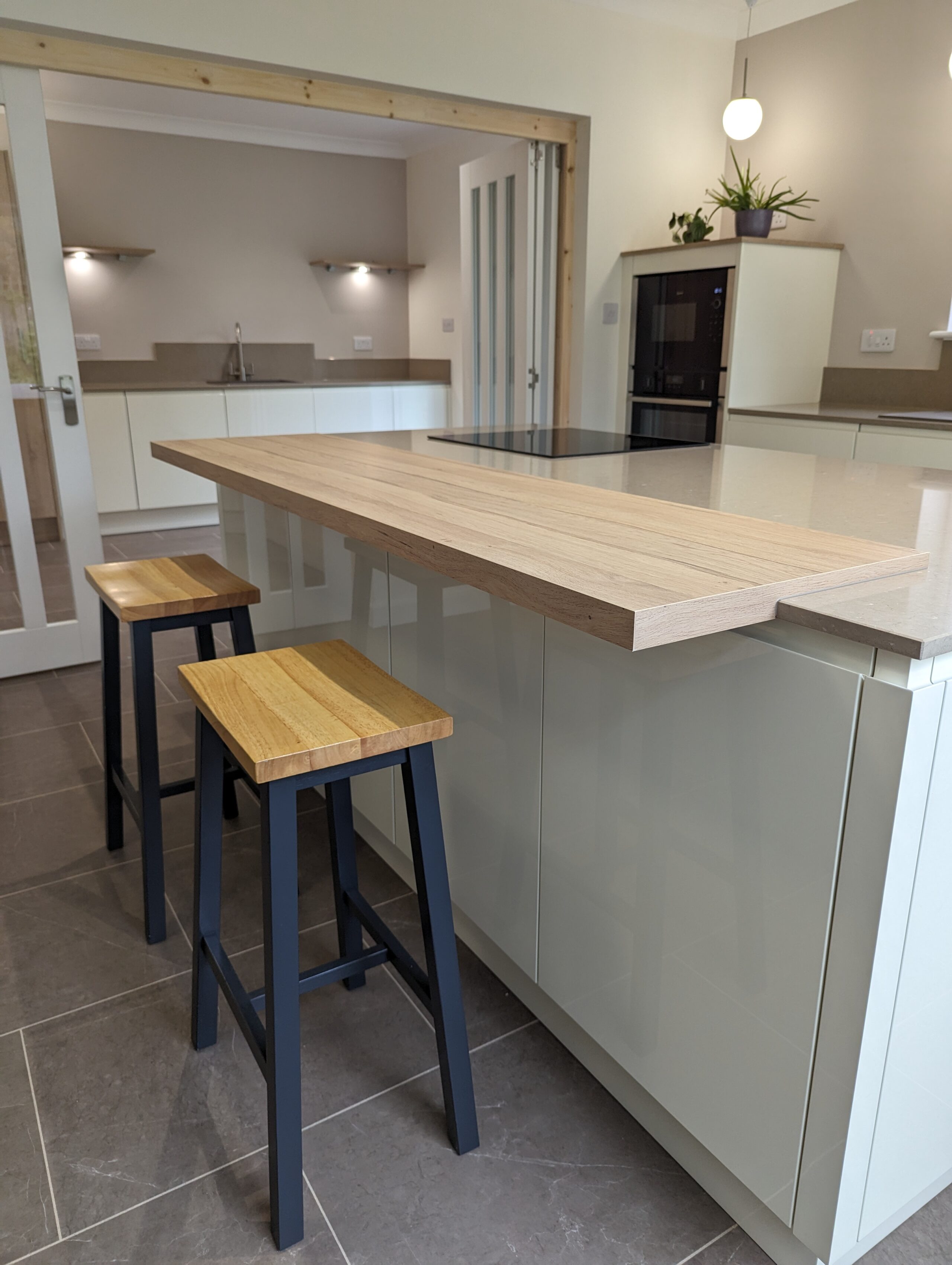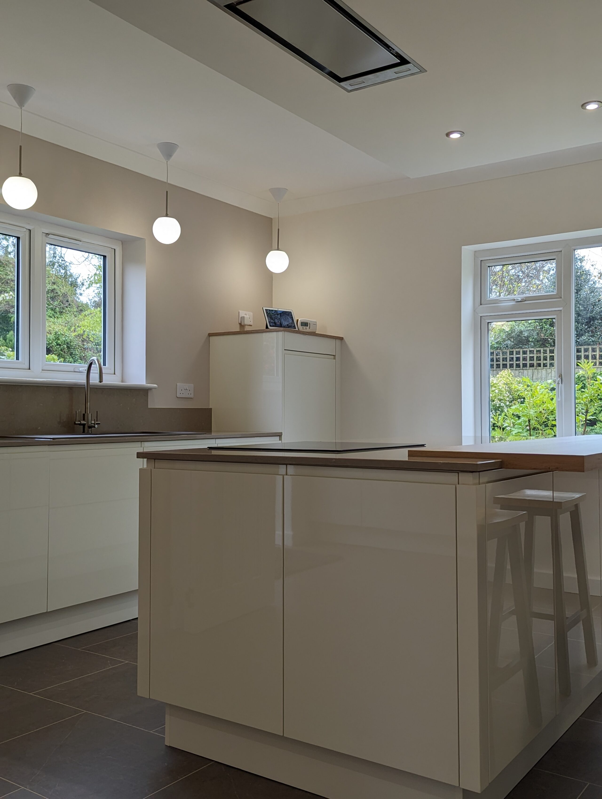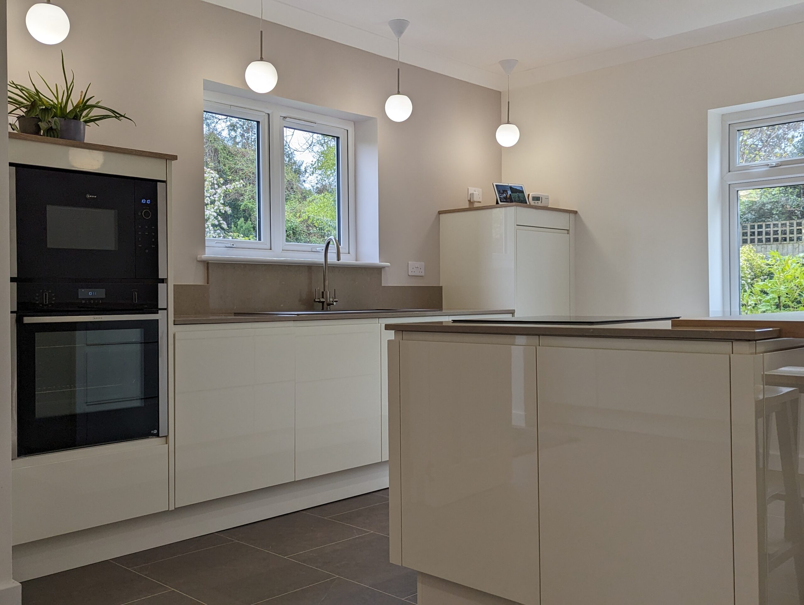 Soft lighting from the globe pendants enhances the gentle colour palette and adds a sense of warmth to the contemporary design. The connection to the garden outside brings in an ever changing backdrop of greenery which further enriches the sense of tranquillity. This project showcases Alex Lee Kitchens dedication to creating spaces that are at once functional, elegant, and beautifully attuned to the character of each home.