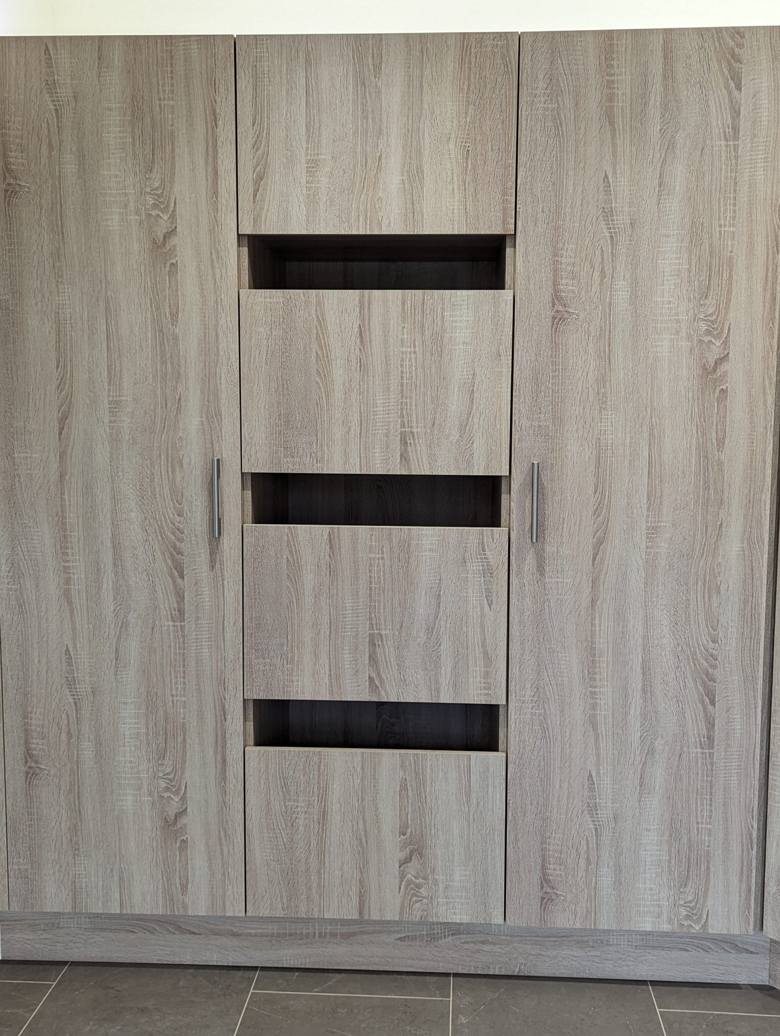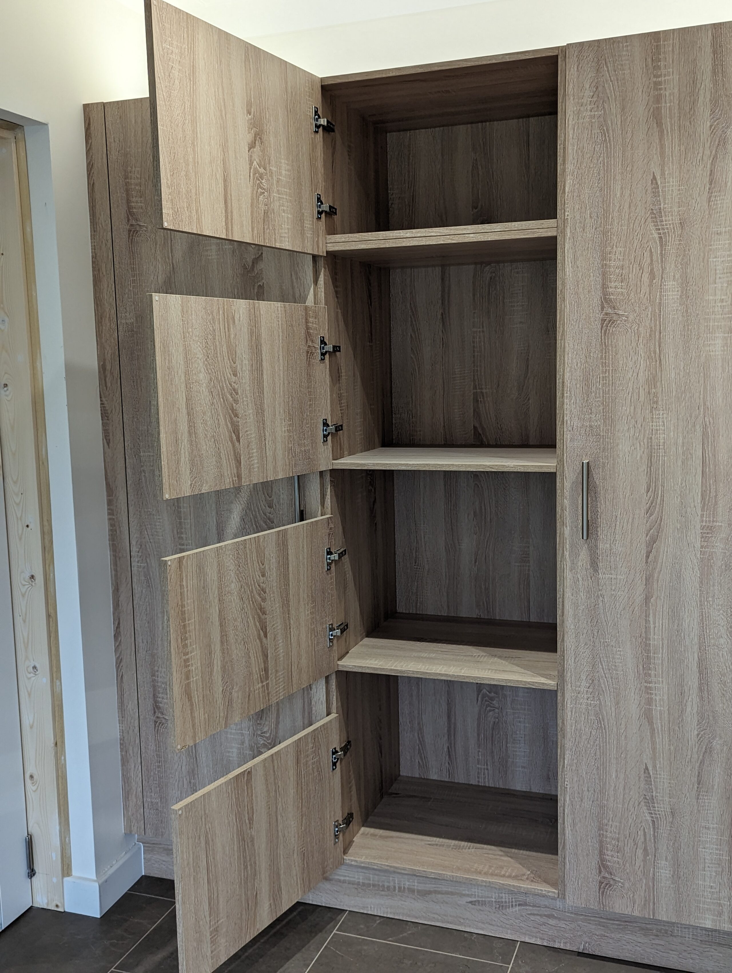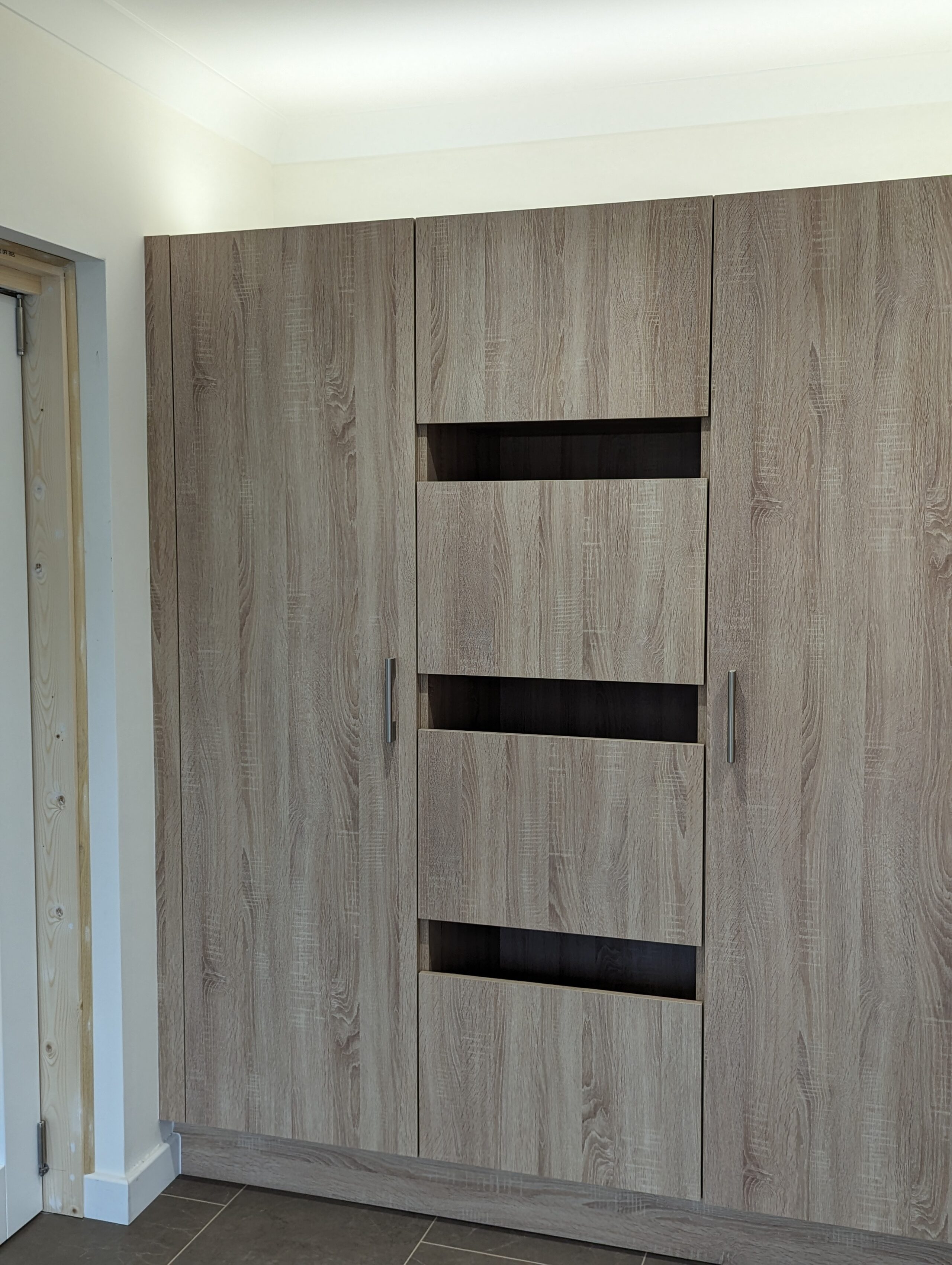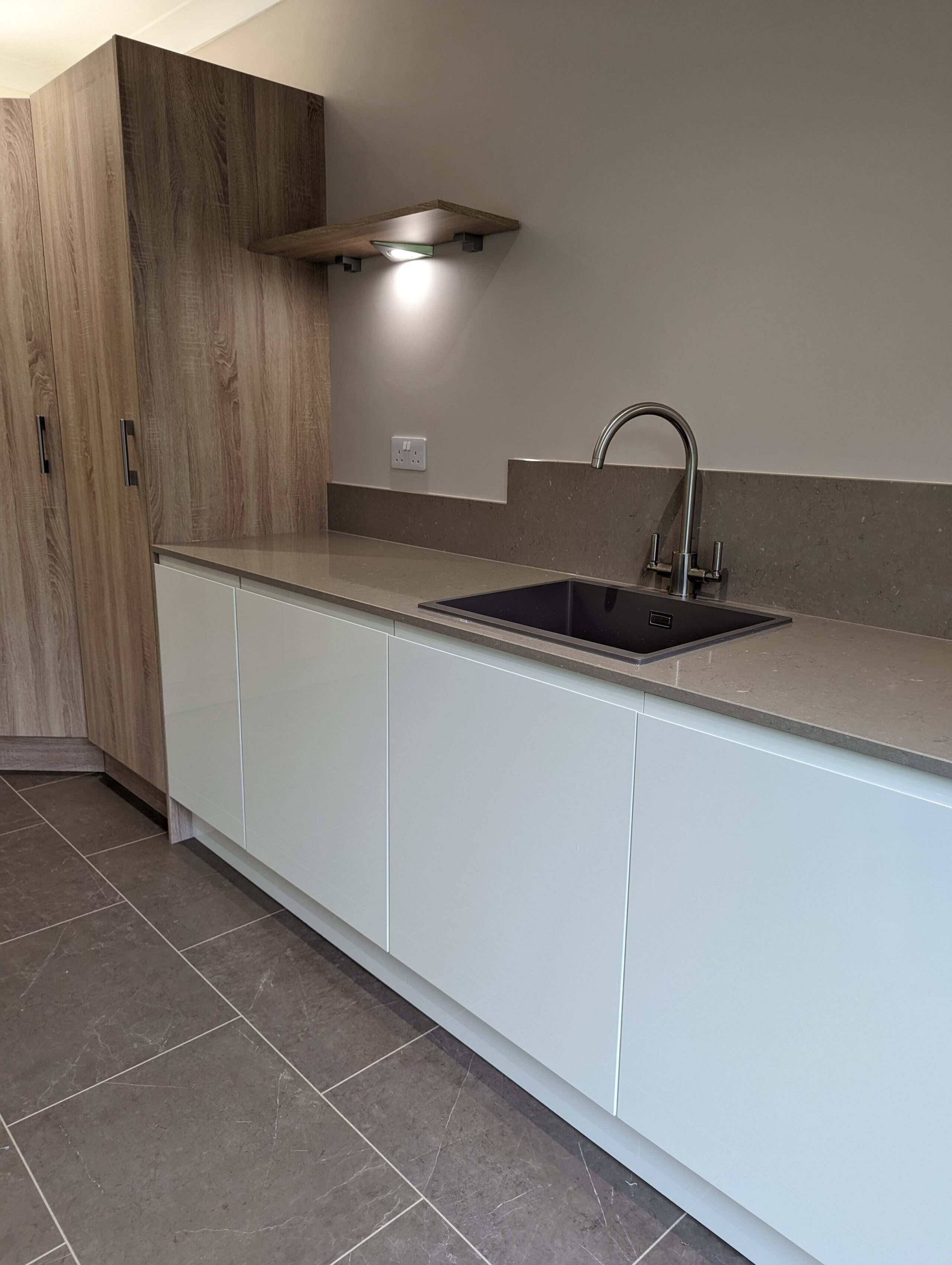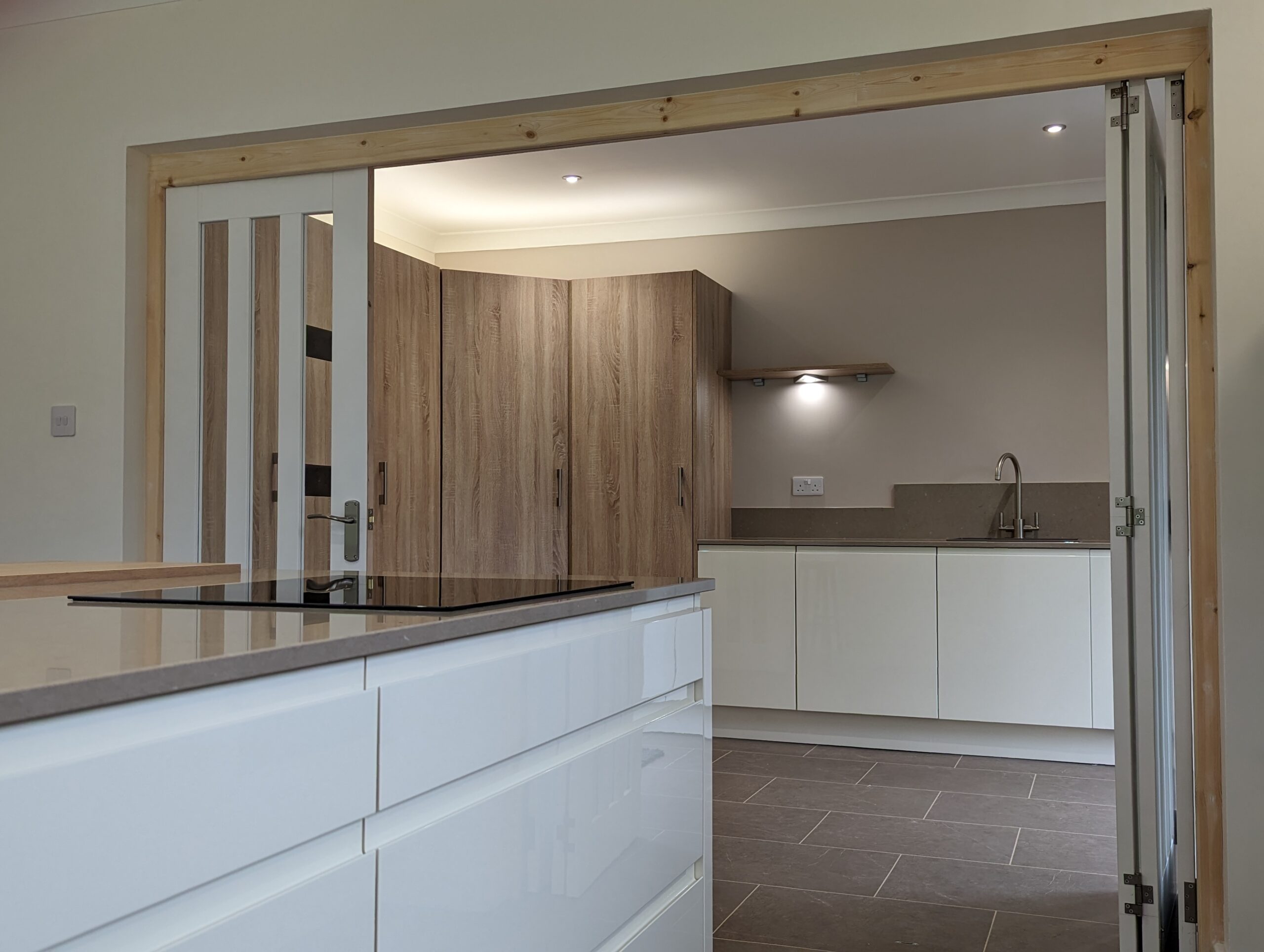 The central island forms the functional heart of the room, providing ample preparation space while maintaining a sleek minimalist profile. Its smooth surfaces and uninterrupted cabinetry allow the design to feel open and uncluttered, while the warm toned worktops introduce a subtle natural contrast. Modern appliances are seamlessly integrated into the scheme, allowing the focus to remain on the clarity and purity of the overall aesthetic.