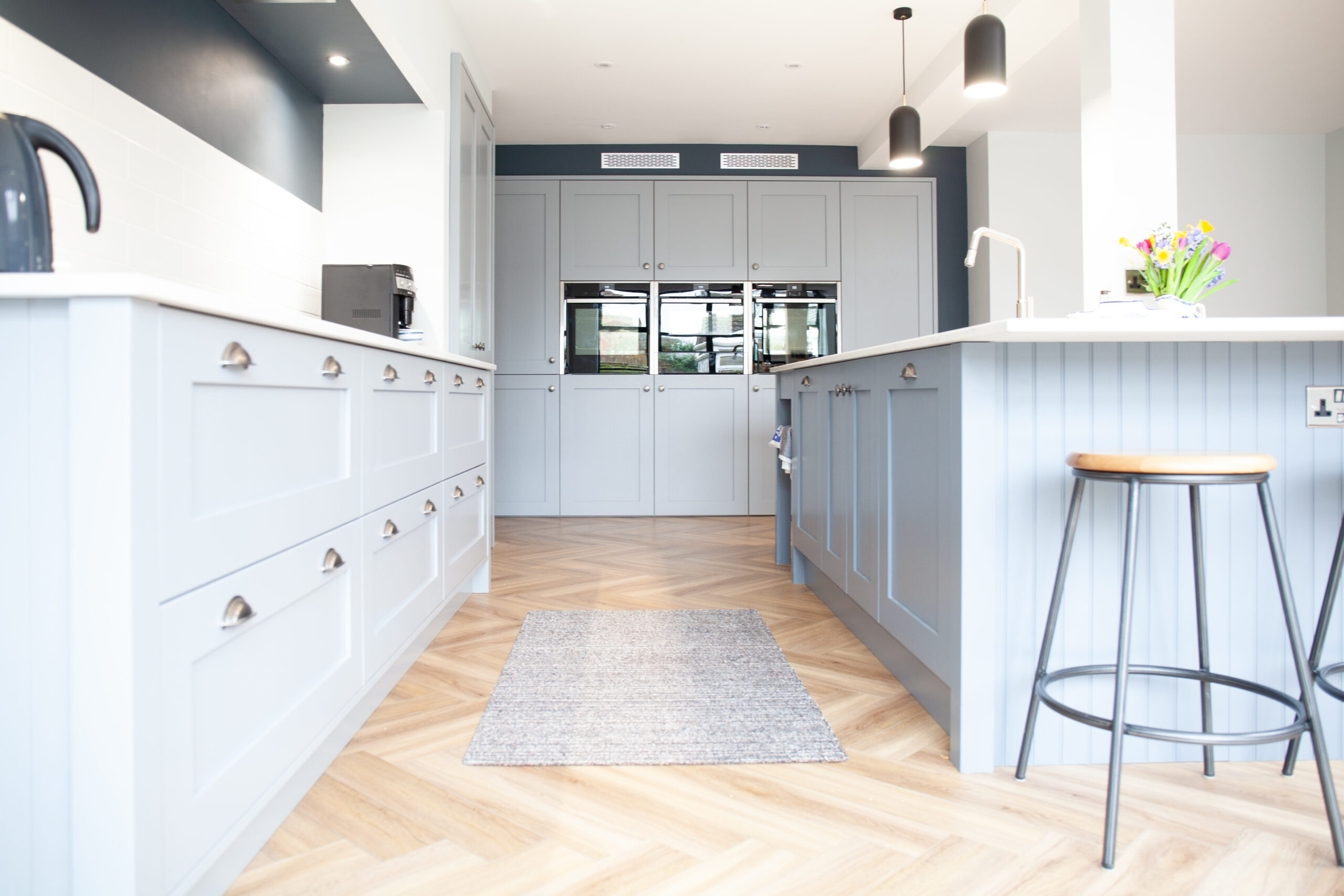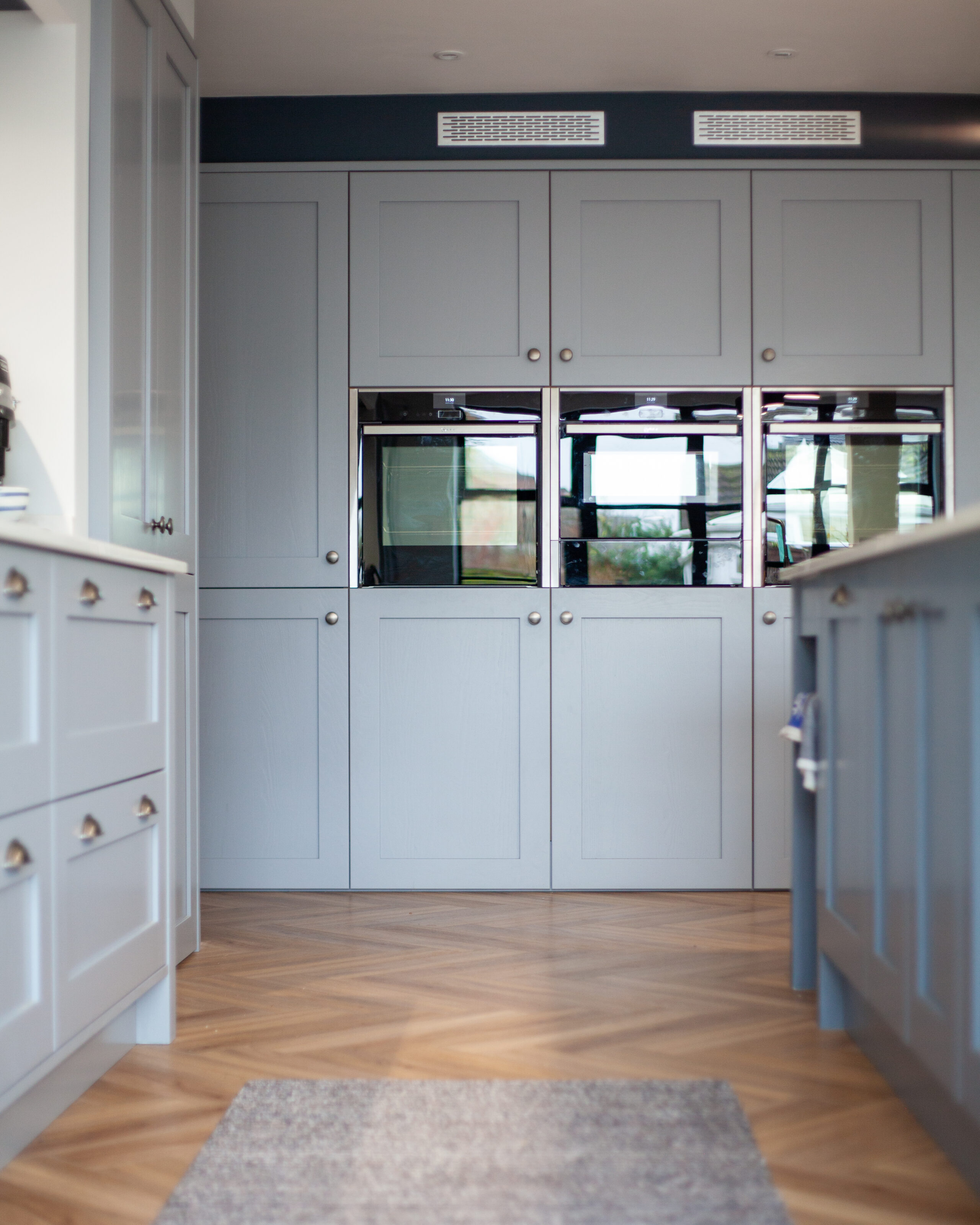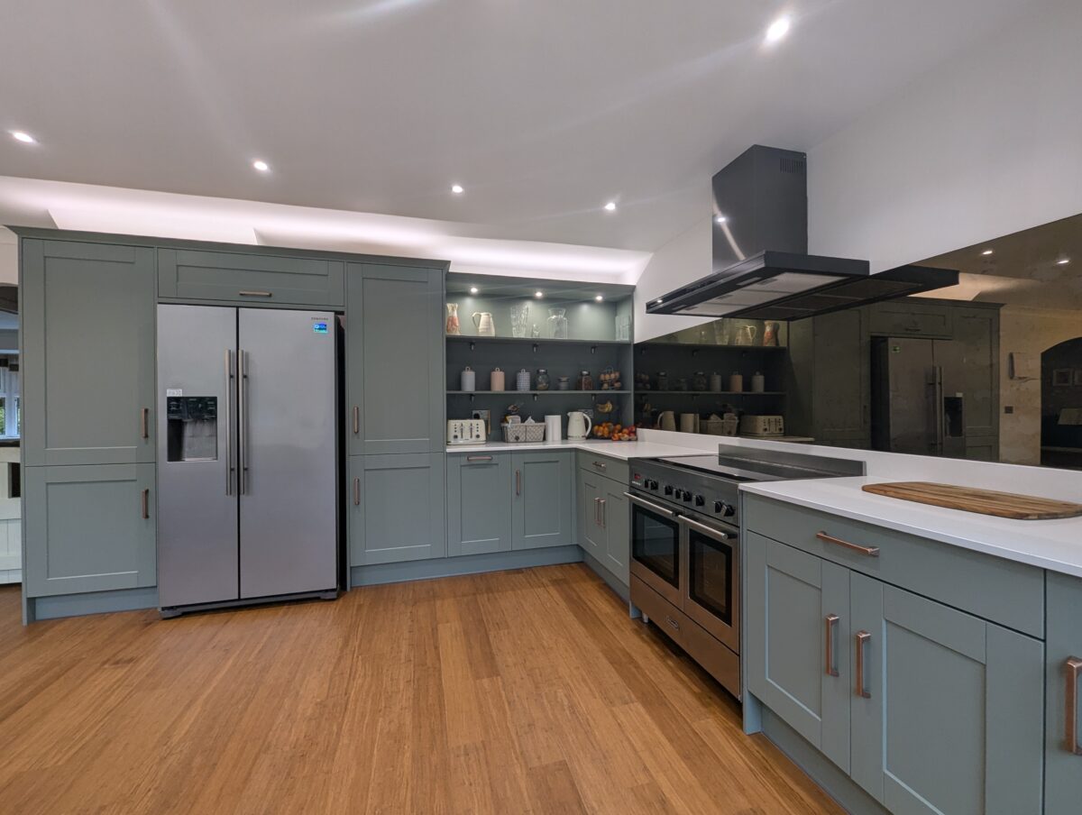 This beautifully refined kitchen by Alex Lee Kitchens brings together soft painted cabinetry, generous natural light, and an effortless sense of calm. The gentle blue tone chosen for the furniture introduces a soothing backdrop that sits perfectly within the bright open plan setting. Clean lines and carefully balanced proportions give the room a composed and elegant presence that reflects the timeless character of bespoke handmade design.