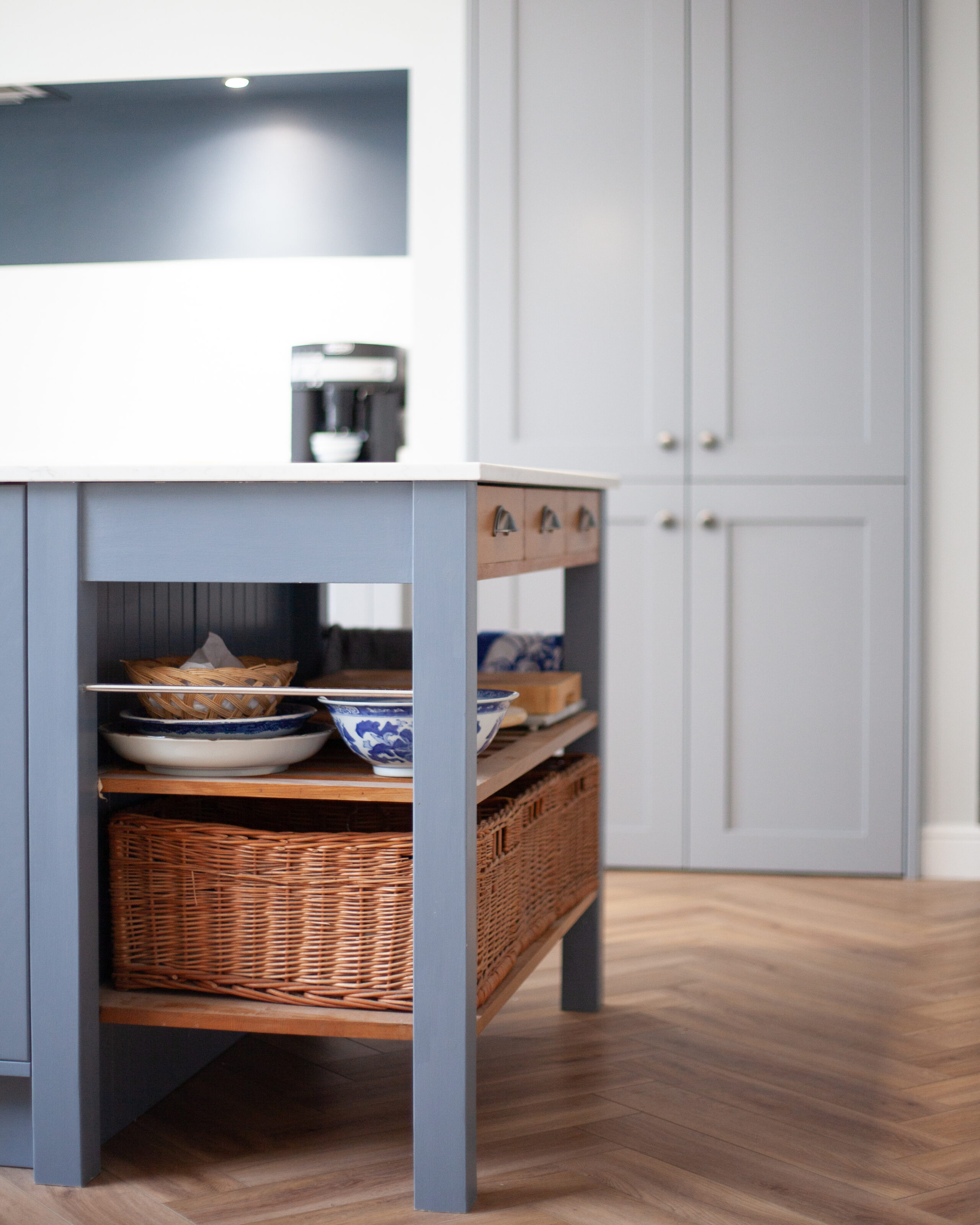 The central island forms a true focal point offering abundant storage, practical workspace, and a welcoming area for relaxed gathering. Open shelving with natural wicker baskets introduces warmth and texture while the crisp quartz surface keeps the overall look fresh and contemporary. The layout flows seamlessly around the space allowing the kitchen to perform beautifully for both everyday family routines and more social occasions.