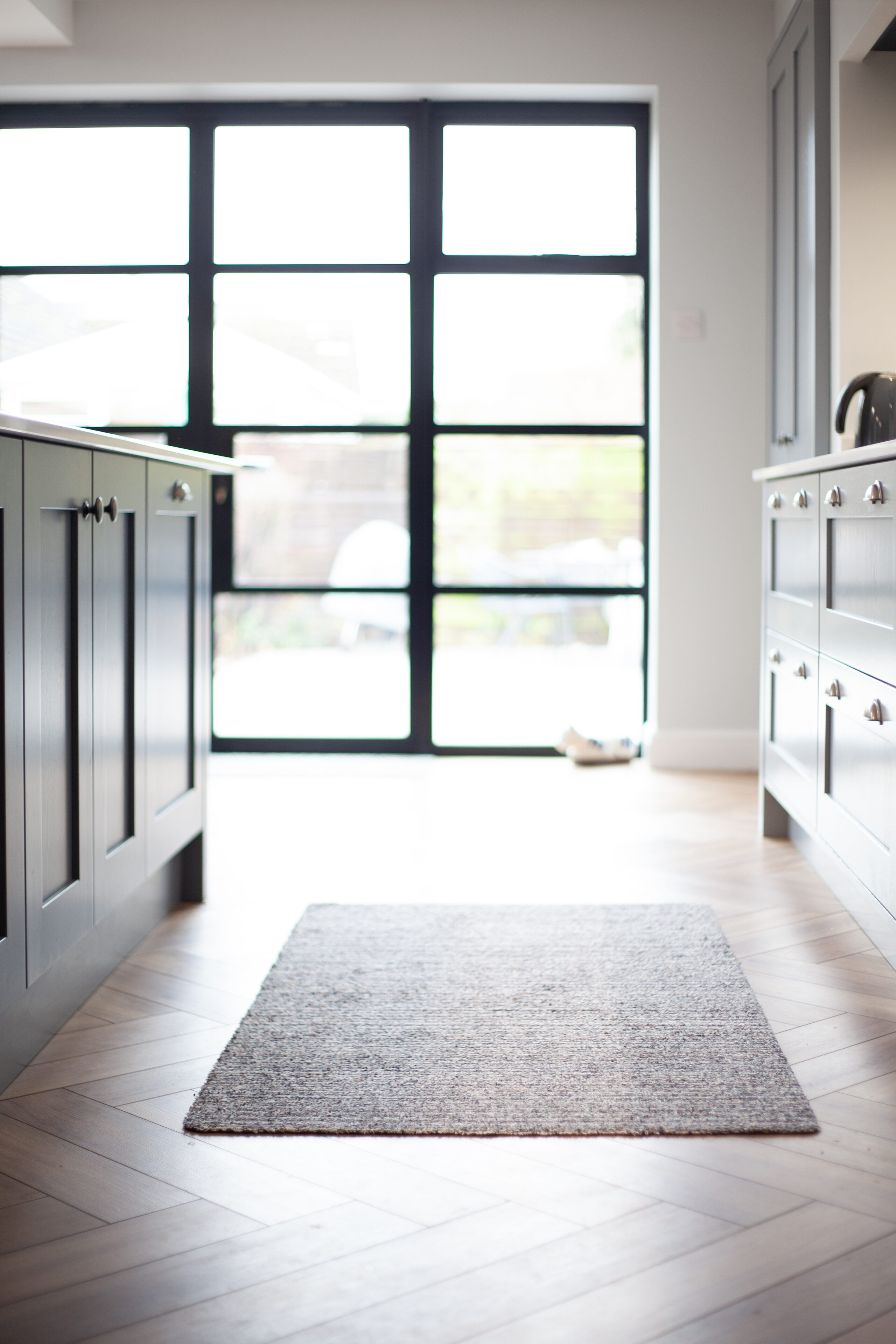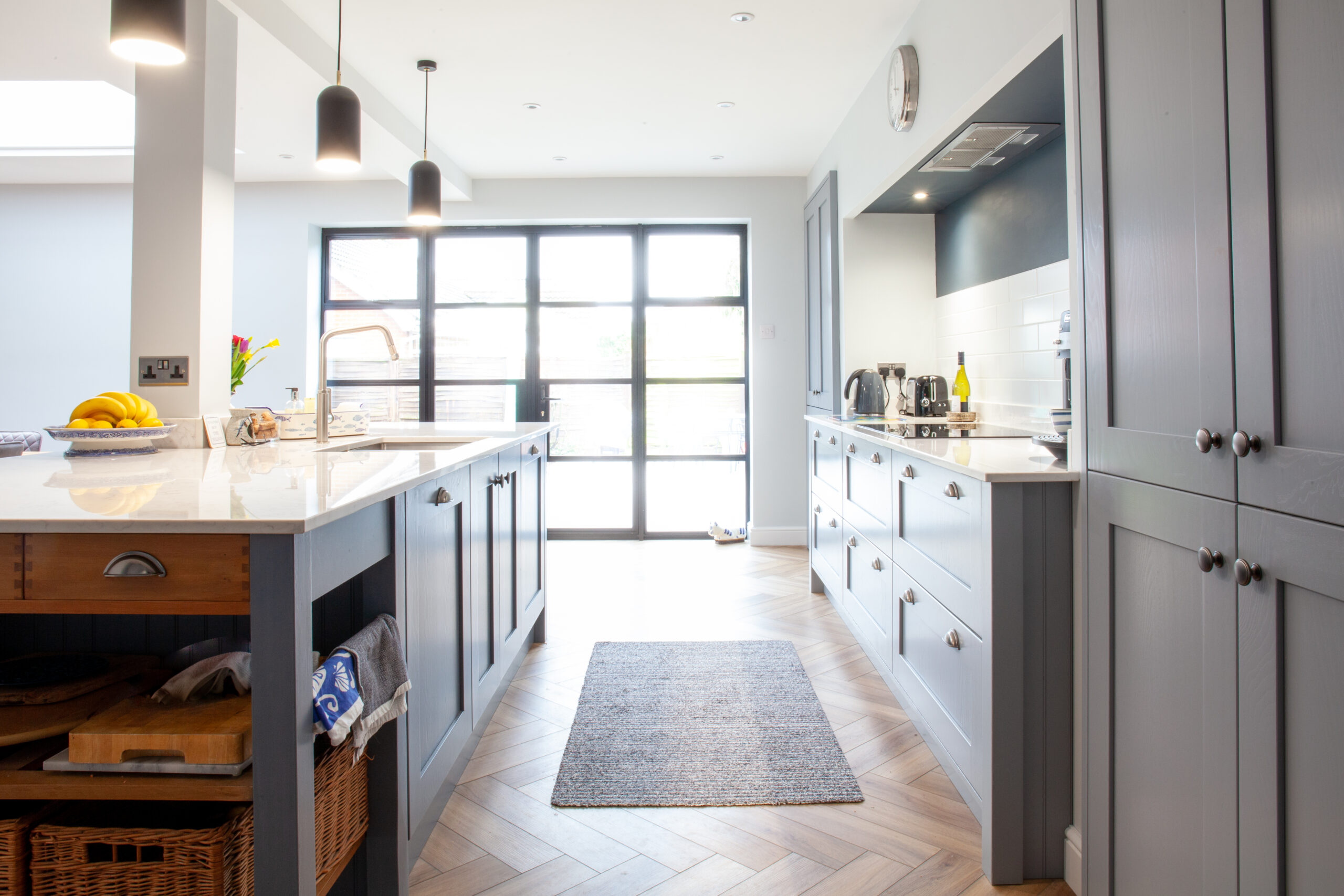 Thoughtfully placed lighting adds subtle depth to the design with pendant fittings softly illuminating the island beneath. A view through the steel framed doors brings a strong visual connection to the outdoors and enhances the feeling of spaciousness. Every detail from the classic knobs to the tailored cabinetry reinforces the calm and inviting nature of the room. This project showcases the Alex Lee Kitchens commitment to creating spaces that feel crafted, welcoming, and perfectly considered.