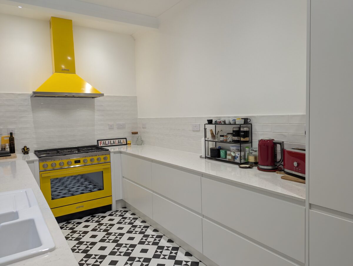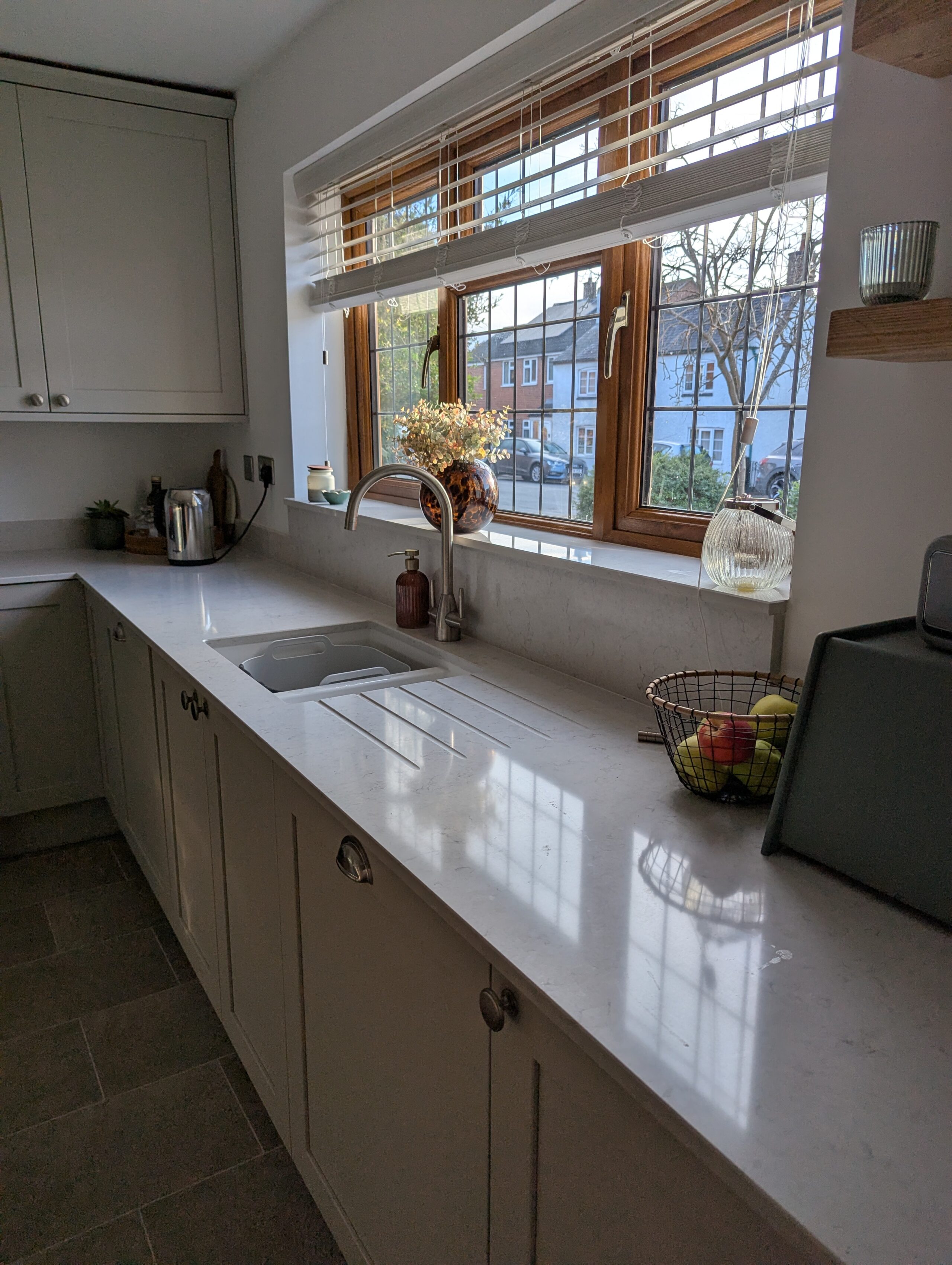 Textured tile behind the cooker and stone effect flooring add layers of interest and create a harmonious link to the natural elements within the room. Light flows gently through the space highlighting the soft colour transitions and the thoughtful craftsmanship of each detail. This project reflects the Alex Lee Kitchens approach of combining classic design elements with modern comfort resulting in a kitchen that feels both beautifully considered and effortlessly homely.